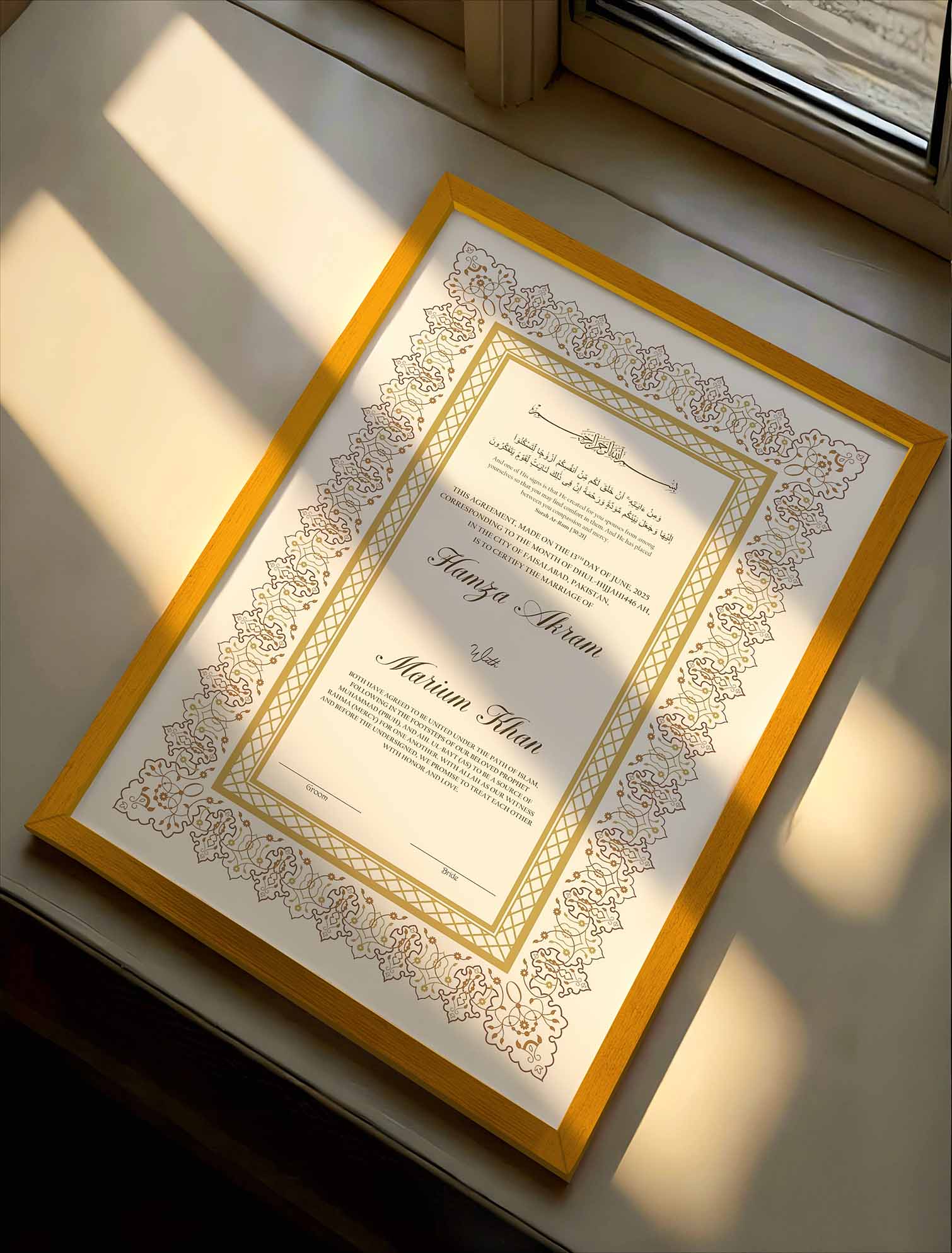 If you need a unique design, we also offer custom design services with an additional fee. Please note that our frames are without glass, and this Nikah Nama Certificate is not a legal document.